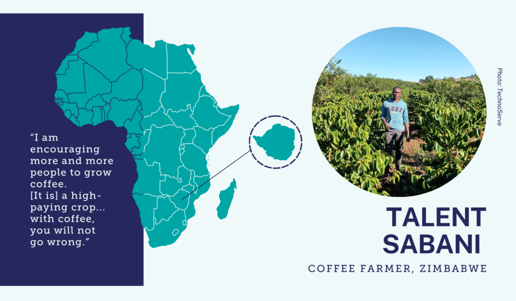 Talent was intrigued. Eager to supplement his family’s income, he decided to plant 1,800 coffee trees near his home in Zimbabwe.