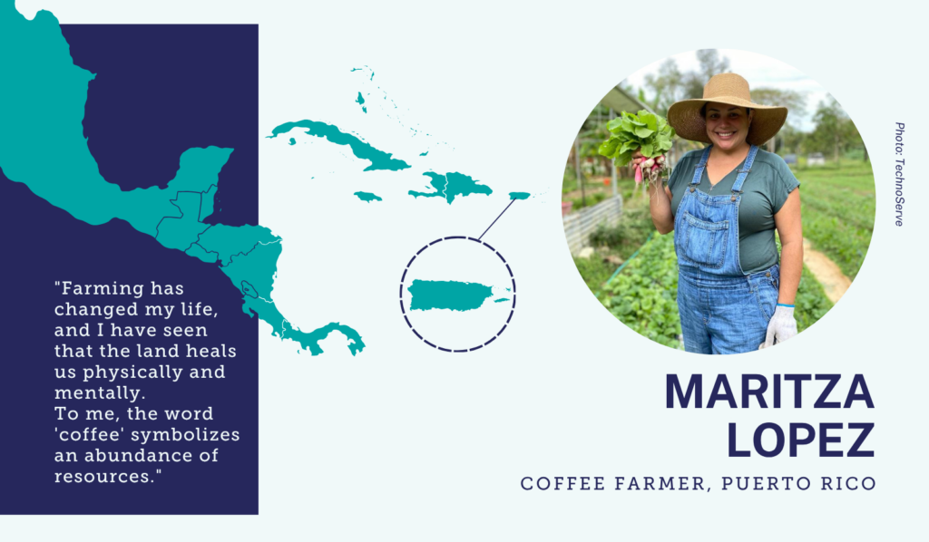 Maritza joined the program in 2020 after Hurricane Maria had already set her family back years. “Like a lot of farmers, it wasn’t until four years after Hurricane Maria that we could finally start harvesting coffee again,” she explained. But she held onto hope. “In agriculture, although one loses the crops, the land remains to continue working on.”