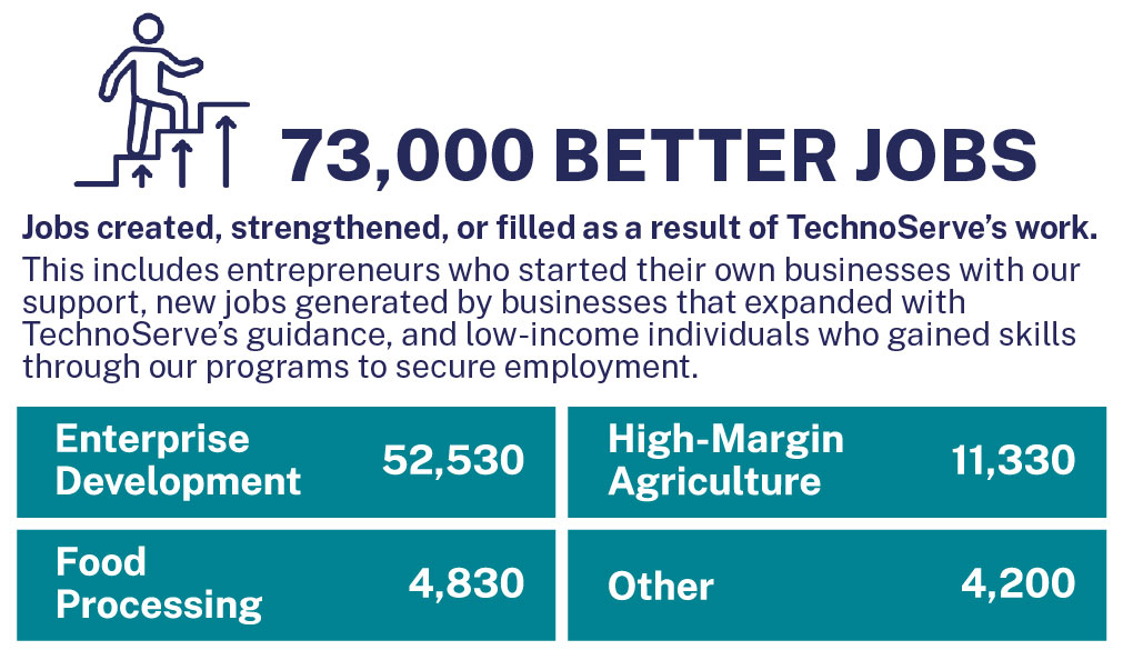 Training entrepreneurs in business skills and connecting them to better financing and markets helps them earn reliable incomes for the long term. In 2022, TechnoServe helped increase revenue of more than 452,136 people and businesses around the world, 80% of which were women.